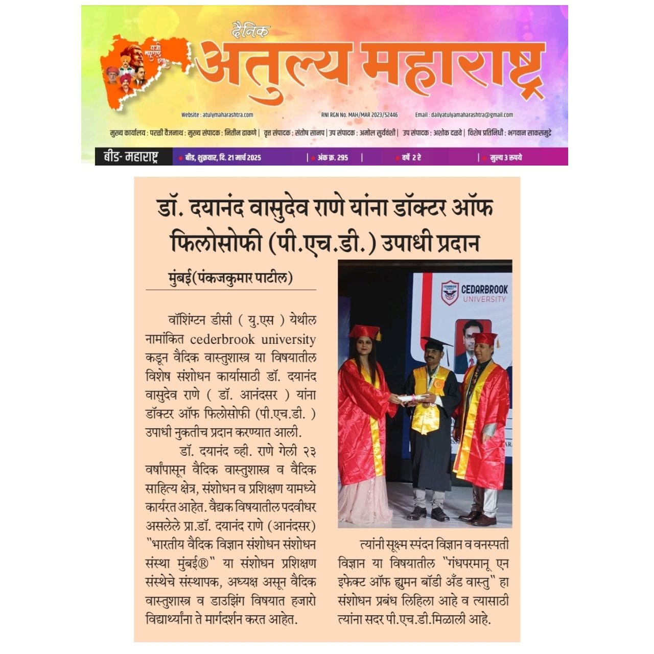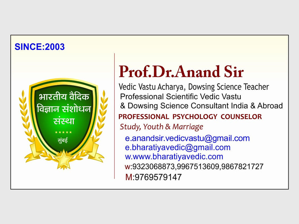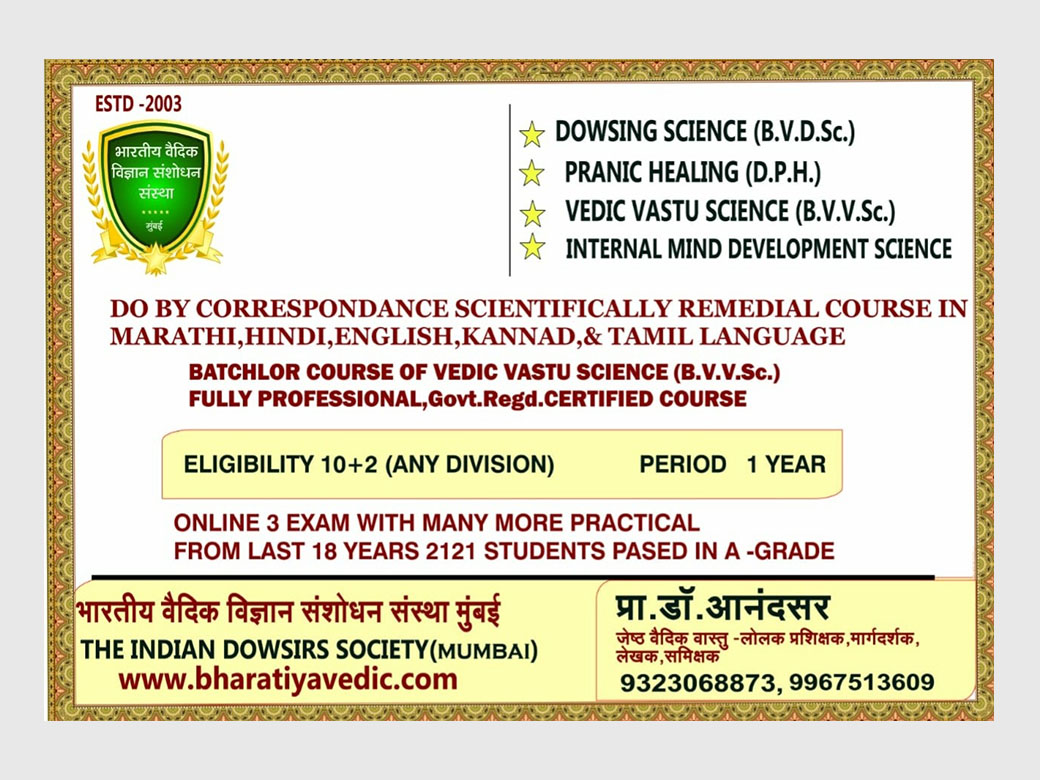 The Institution was established at Borivli, a suburb of Mumbai in the year 2003 by Dr. Anand sir (Dr. Dayanand Vasudev Rane) who now functions as Chairman of the institution. Dr. Anand Sir has delivered various lectures on Vaidic Vastu-Shastra and Dowsing at many temporary centers like Maharashtra, Gujarat, Goa, Karnataka, Madhya Pradesh etc.